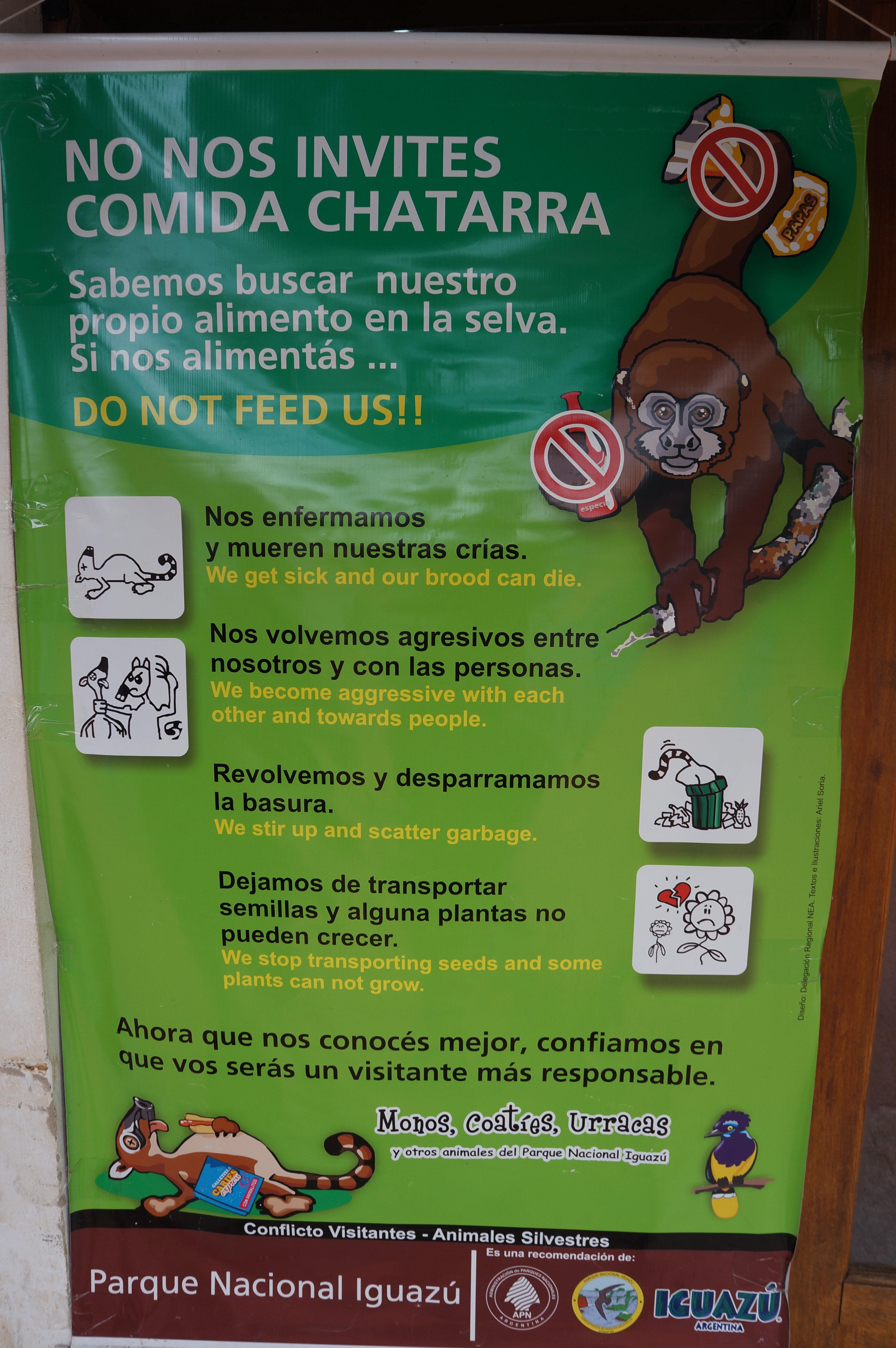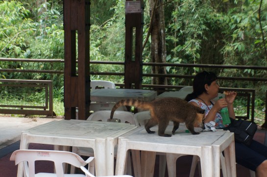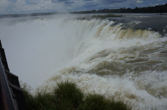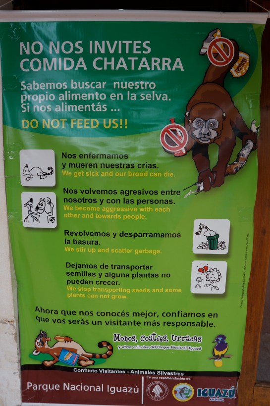Pantalonii mei scurti au 5 kile, tricoul mi l-am scos, mi l-am stors, e jiav, am fost sub cascada la Iguazu cu barca, mie mi s-a parut 3 minute, in pliante zic ca 20 de minute, daca si eu cred in publicitate, hehehe, cert e ca nu am vazut nimic, am stat cu ochii stransi si m-am rugat sa iesim din peretele de apa sa pot sa respir.  Pilotul barcii e un corb carbonizat, cizme de cauciuc galbene, nas acvilin, sa aiba vreo 60 de ani, imobil, isi trage pelerina de ploaie pe el si a 786 oara intra sub cascada, unii au de impins o piatra la deal, altii de bagat o barca sub apa, un localnic care se da ghid rage fericit la prora agitandu-si mainile, gata, cele 20 de minte sunt mai scurte la tropice. Incepe batalia cu hoardele care bifeaza peisaje, click, click, ai facut poza? bine, atunci hai sa mancam, pune mana draga aici, haideti si dumneavoastra domnule Bjorg, uite o doamna pe tocuri, toc-toc-toc pe podetele metalice alunecoase de la stropii cascadei. Peste tot scrie sa nu dai de mancare la animale-in 2 limbi, engleza si spaniola, sunt si niste desenase care iti arata maimuta si coatiul cu x-ulete in loc de ochi, dar nimanui nu-i pasa, lumea e pe sharing, ia de aici frate tucanule niste hamburger.