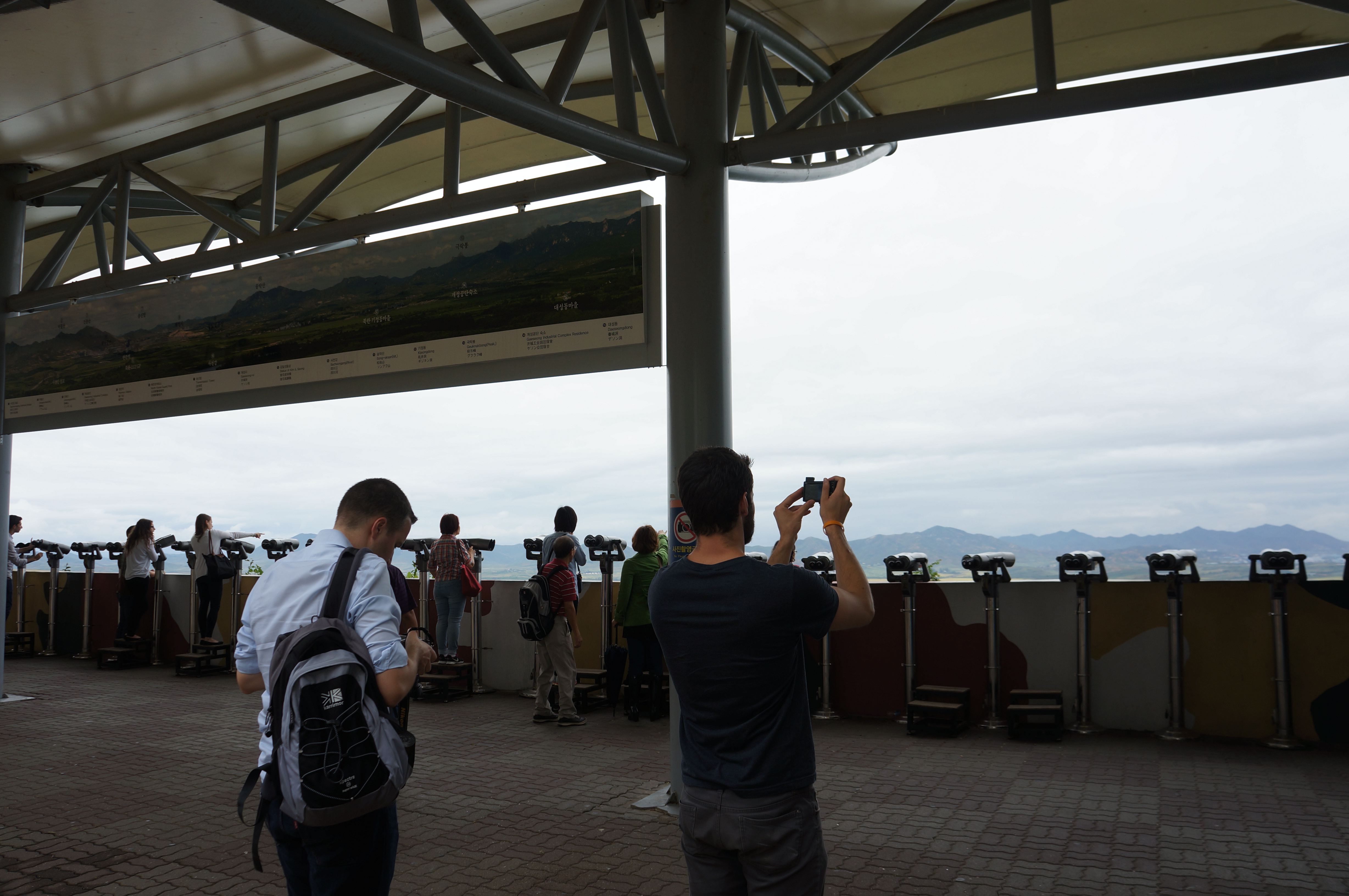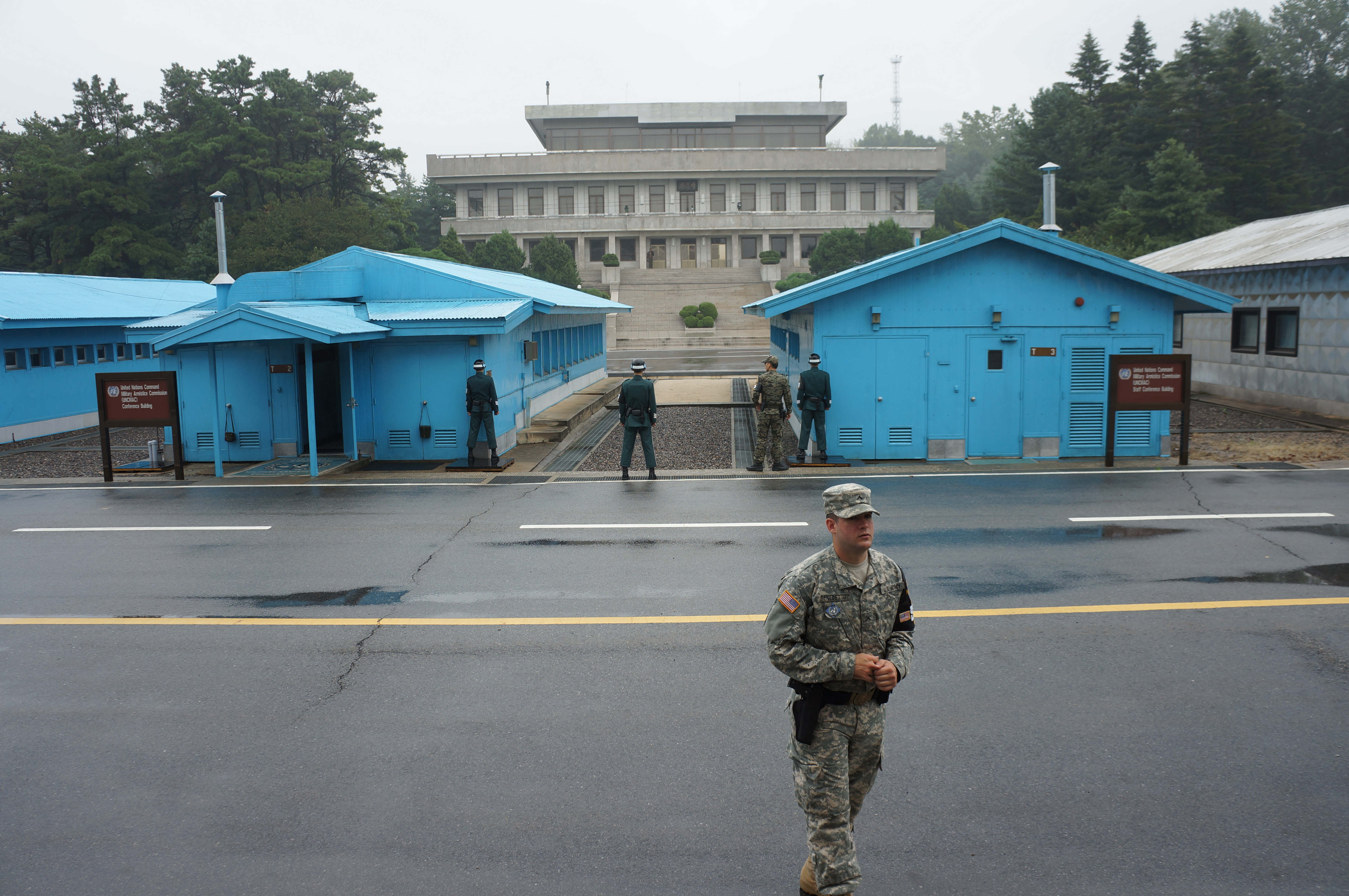 frontierea se intinde ca un snur de ciment, calcata de 3 baraci albastre. cu spatele la noi stau 3 soldati sud coreeni, cracanati, pumni stransi, pozitie de tae kwon do, doi dintre ei ascunsi pe jumatate de doua dintre cladiri, unul in mijloc. ce fac acolo? sunt tinte pentru sniperi in cazul in care iese vreun taraboi si incepe sa se traga. cei ascunsi pe jumatate au astfel mai multe sanse sa nu fie impuscati mortal. pai si domnu din mijloc? el e pus mai la caterinca, pentru turisti, ca da bine in poze. disneyland ideologic. alti 3 soldati se plimba prin fatza noastra, raybani purtati la intimidare si..unul din ei se duce glont la benedetto, zice ceva la urechea sergentului, acesta tzasneste catre unul dintre turisti “sir, you made a picture with that building? please erase that picture for me”, da’ ce-a pozat domle?, o cladire mai la dreapta, nimic special. monkey house e goala, nimeni nu-i inauntru sa o provoace pe doamna kennie, un singur nord corean sta teapan la intrarea in cladirea plina de camere si lentile intoarse catre sud din spatele carora, spune benedetto, suntem studiati cu atentie. imi aranjez parul sa fiu sigura ca nu o fac de rusine pe mama.
